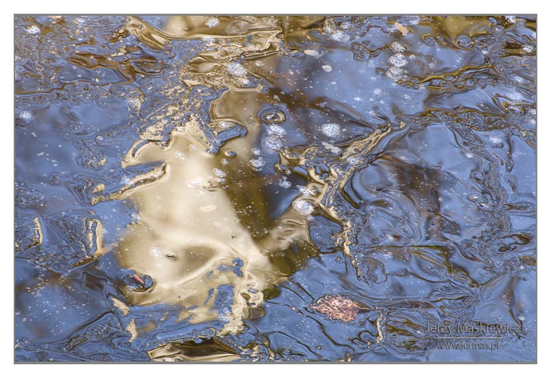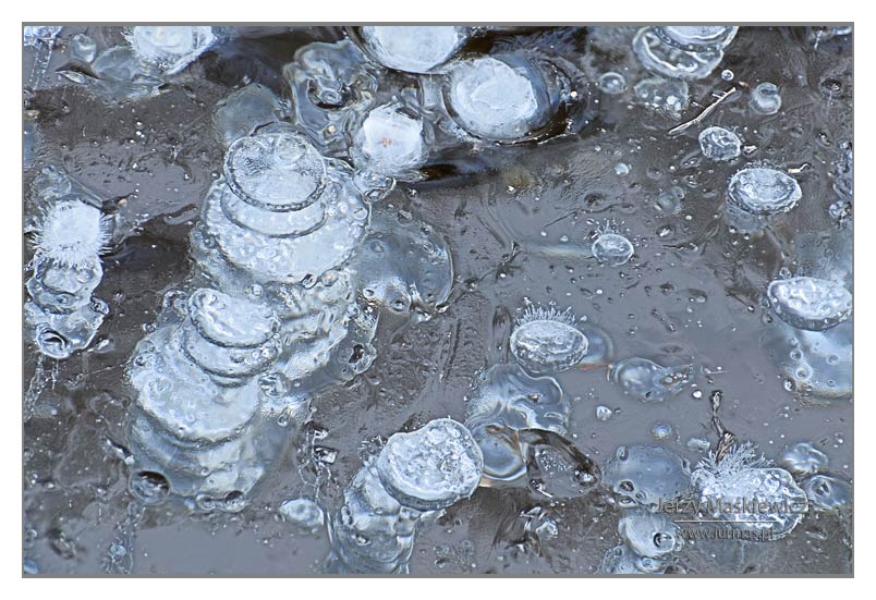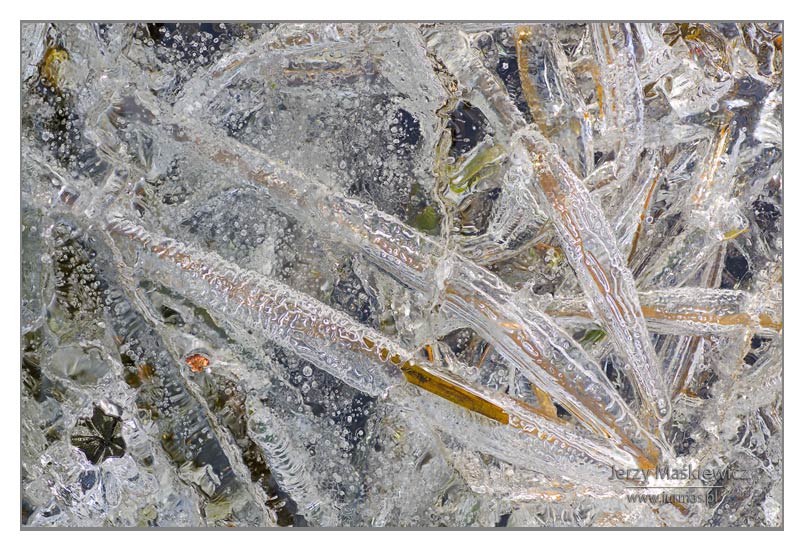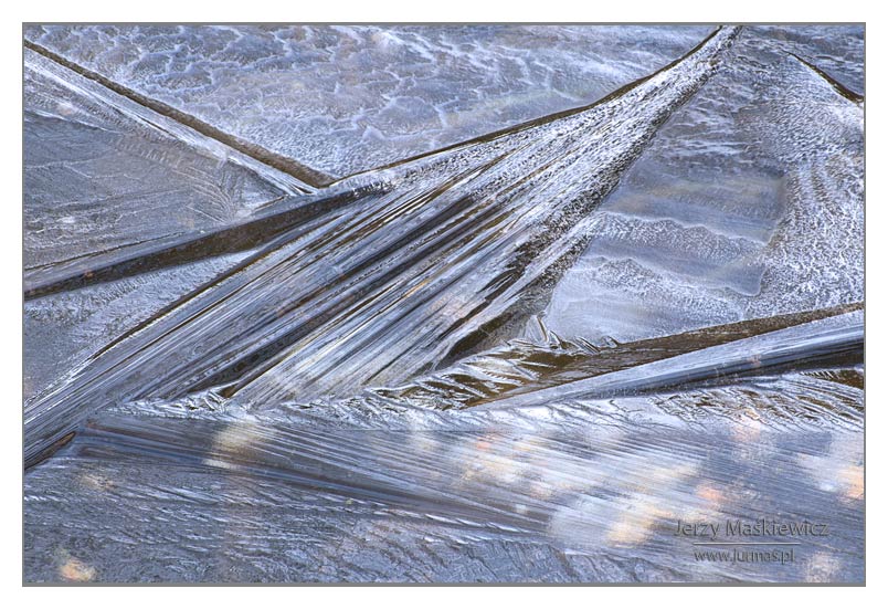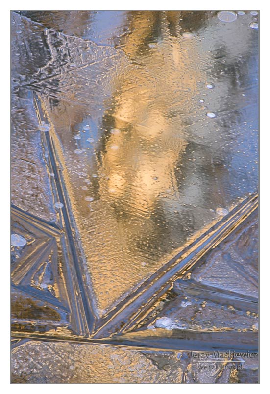 Czasami – choć brzmi to dziwnie jak na tę porę roku – temperatura spada poniżej zera. Budzi się mróz…. Rankami oszroni świat. Czasami większy – zetnie strugi wodne, kałuże, stawy i jeziora. Pomarszczy je w różne kształty, które nam widzom nasuną różnorakie skojarzenia ze światem rzeczywistym