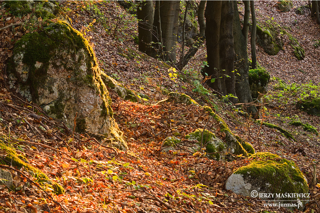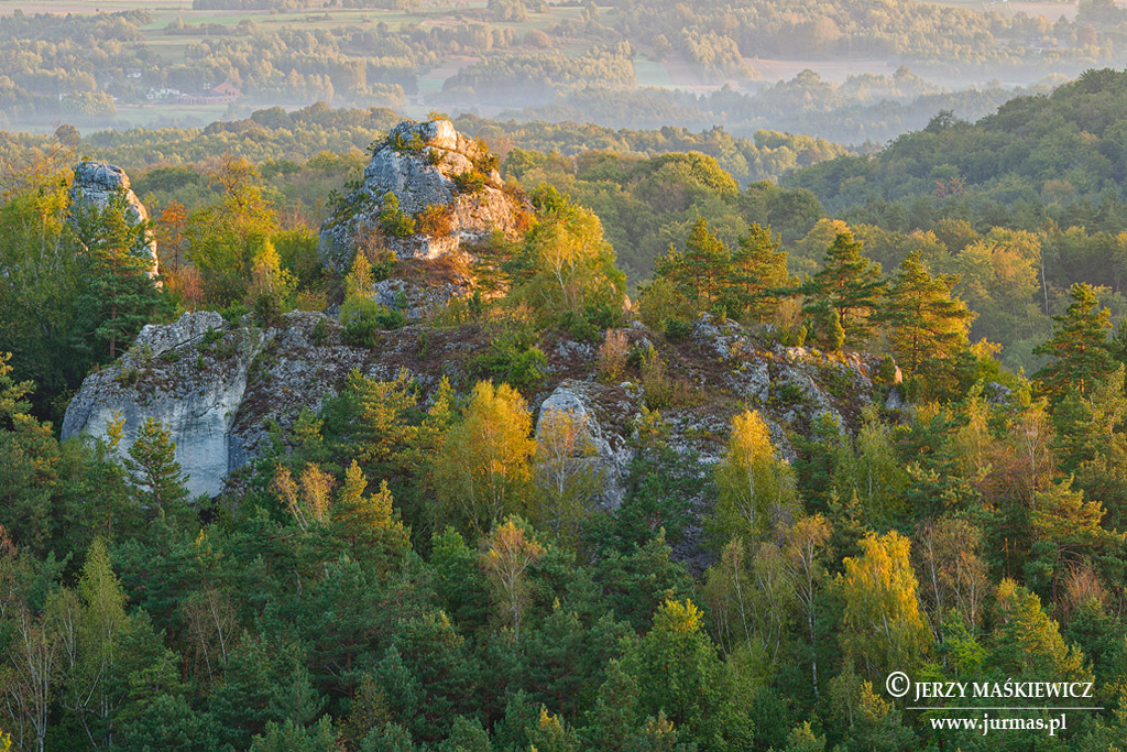 Punktualnie wyłania się wielki czerwony krąg, czerwone i jasnożółte barwy pokrywają w dole liściaste lasy, złocą biel wielkich ostańców. Droga w dół jest łatwiejsza, las jeszcze nie jesienny. Czasem, z podmuchem wiatru, na brunatne dno lasu spadnie suchy liść, zalśni rosą pajęczyna.