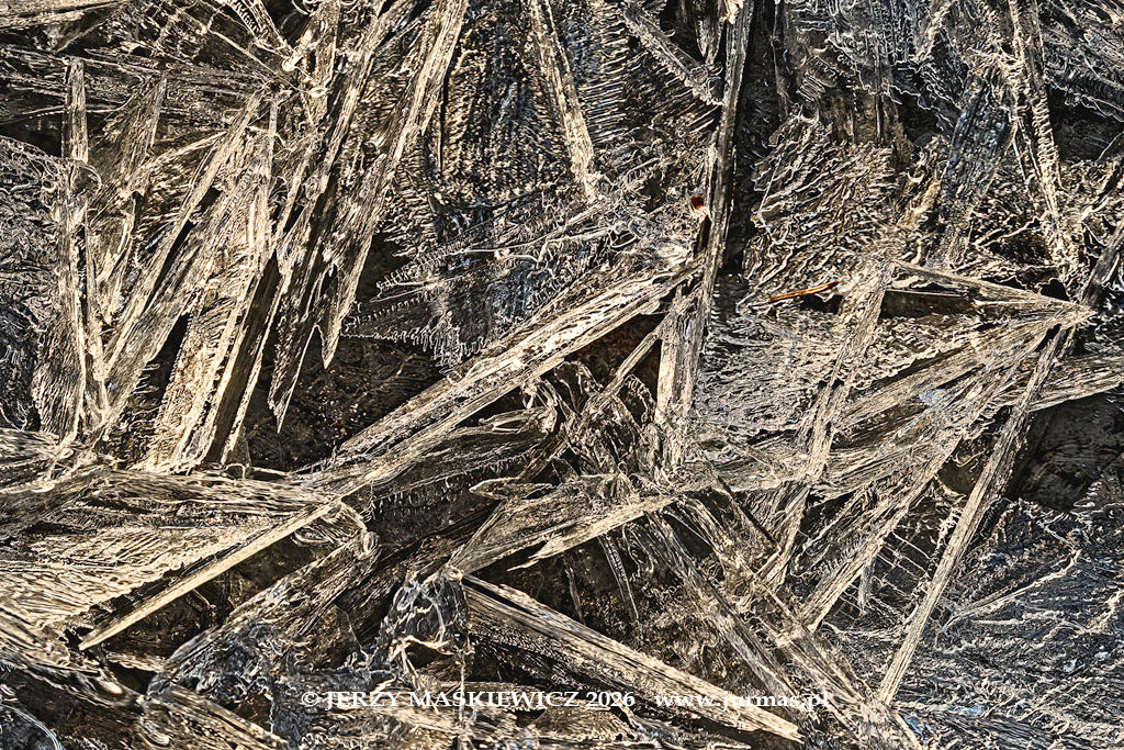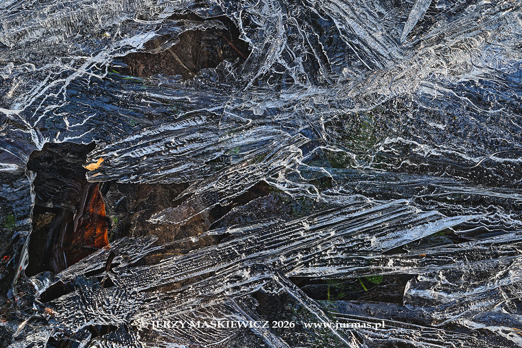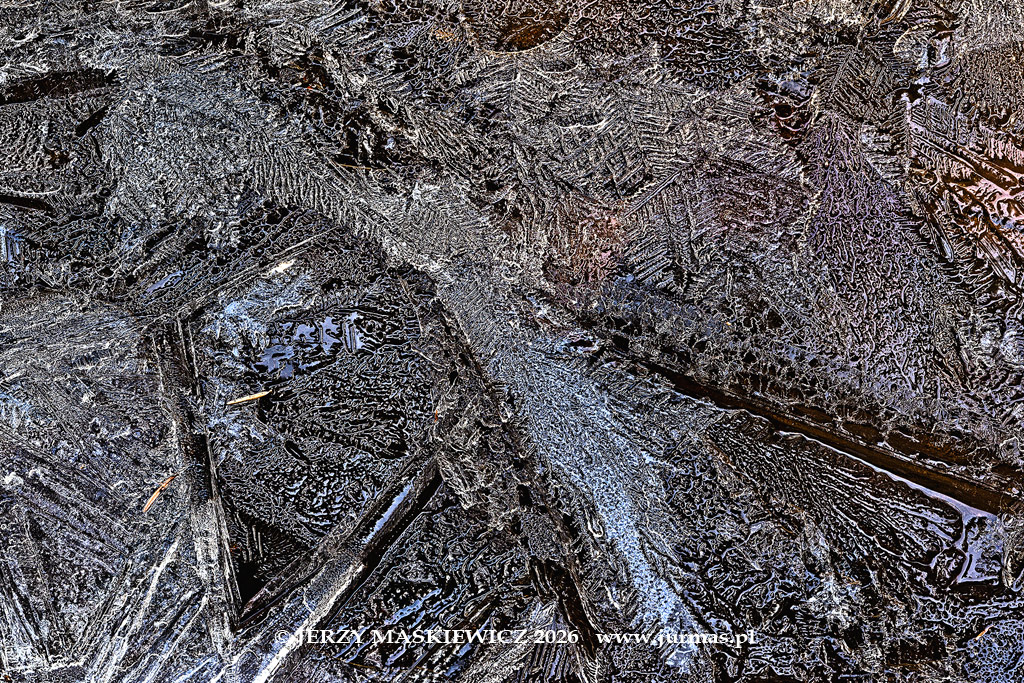 Od lat regularnie wybieram się na wędrówki po tym białym, nieruchomym i mroźnym krajobrazie, by zachwycać się mnogością kształtów, w jakie może formować się lód pokrywający zbiorniki wodne. Nawet zwykła kałuża w środku lasu czy na polnej drodze przekształca się w ulotne dzieło sztuki. Tej zimy urocze płatki śnieżne na długo ukryły to magiczne piękno. Ale czy na pewno?