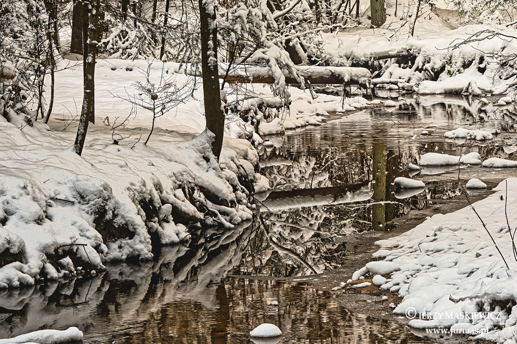 Zimowy poranek, wyciszony, wybielony las, pod nogami dźwięk świeżego śniegu. „Z wierzchołków drzew za najlżejszym podmuchem sypią się mikroskopijne pyłki śniegowe i migocą tysiącami promieni… Wydaje się, że tam, na szczytach drzew, zasiadły duchy maleńkie zimy i otrząsają skostniałymi rękami puszek śniegu z każdej igły sosnowej” (S Żeromski). Wreszcie jestem nad potokiem zastygłym w zimowym śnie.