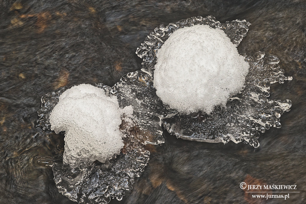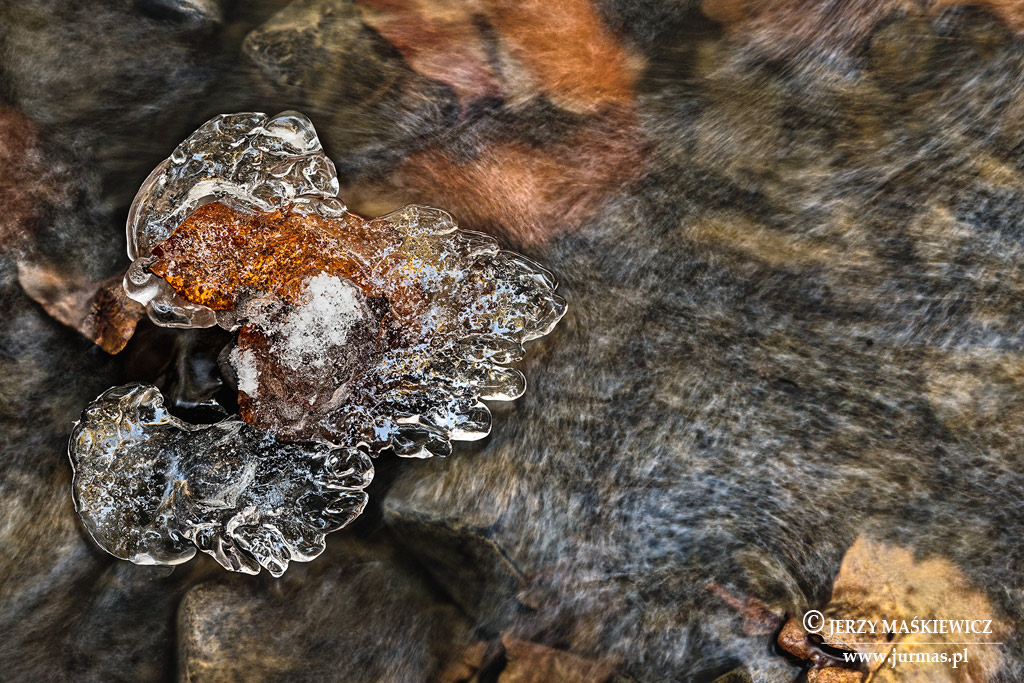 Tylko miejscami na skalnych progach woda płynie wartko, a z nią, na malutkich taflach lodu, czapy śniegu. Czasem w tym wirze wodnym pojawia się jesienny wędrowiec – liść. Ociężały, zmęczony wędrówką czepił się krawędzi kamienia, a wędrujący artysta mróz otulił go szczelnie lodową koronką. Czy ruszy dalej?